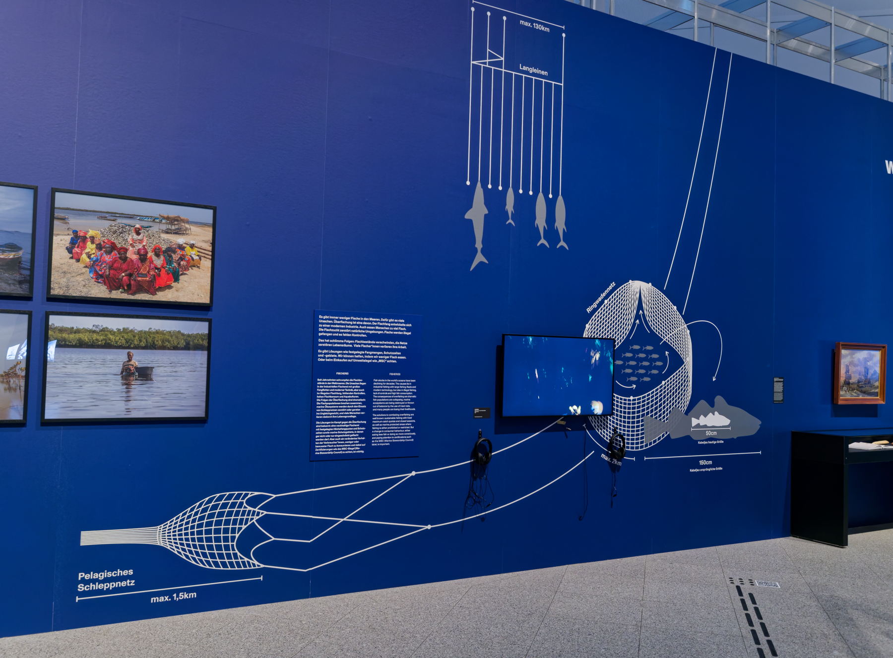 Wissenschaft, Soziales, Kultur und zeitgenössische Positionen in der Kunst in einer Ausstellung vereint – Wow, das klingt interessant. Leider konnten meine Erwartungen nicht ansatzweise erfüllt werden. Diese relativ kleine Ausstellung ist mit der Vielfalt der Themen überfordert. Die Exponate sind eher lieblos arrangiert – mehr Infografik als Emotion. Das Licht als Gestaltungswerkzeug konnte (mich) nicht überzeugen. Das Konzept dieser Ausstellung sehe ich eher in einem großen Foyer oder Aula – nicht in einer Bundeskunsthalle. Die erste Unterwasser-Fotografie von Louis Marie-Auguste Boutan hätte thematisch besser zu Anna Atkins Cyanotypien gepasst und nicht in dem Raum der von Jules Verne „20.000 Meilen unter dem Meer“ dominiert wurde. Bilder vor einer Motivtapete zu präsentieren erschließt sich mir auch nicht so richtig. Hans Hass, einer der Pioniere der Unterwasserforschung fehlte gänzlich. Sklavenhandel, Migration und Fischerei werden als langweilige Grafik/Foto-Text-Kombinationen präsentiert. Die angekündigten „aktuellen Positionen in der Kunst“ sind eher Beiwerk als Schwerpunkt.