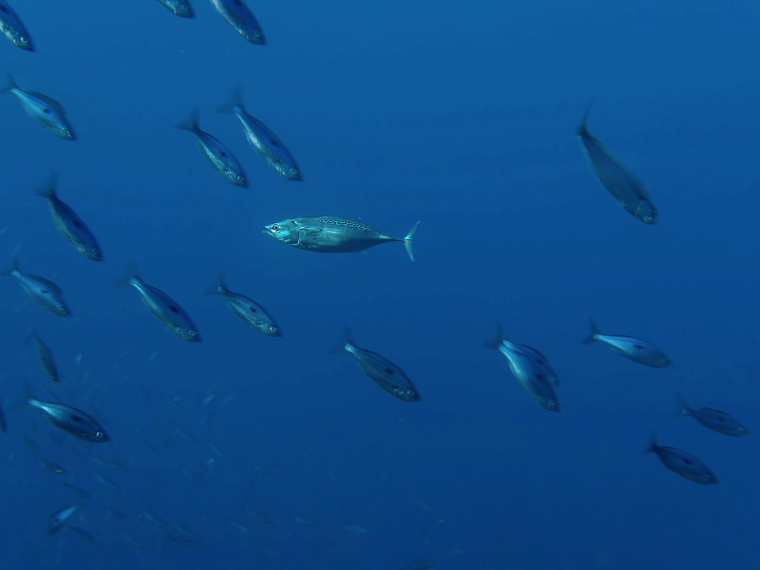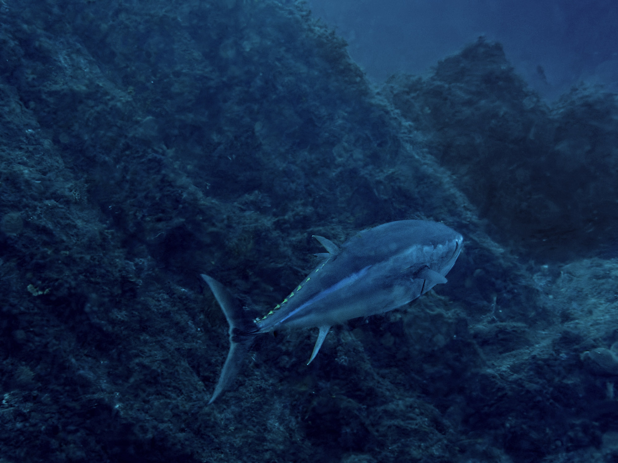 Vielleicht lag es an den hohen Wassertemperaturen und Schwärmen von Gelbstriemenbrassen, Riffbarschen und anderen kleinen Fischen das zwei Arten von Thunfischen am Cap Dramont zu sehen waren. Die Tiere sind sauschnell, schwimmen vorbei und sind auch schon wieder verschwunden. Uns sind daher nur wenige (schlechte) Schnappschnüsse gelungen.